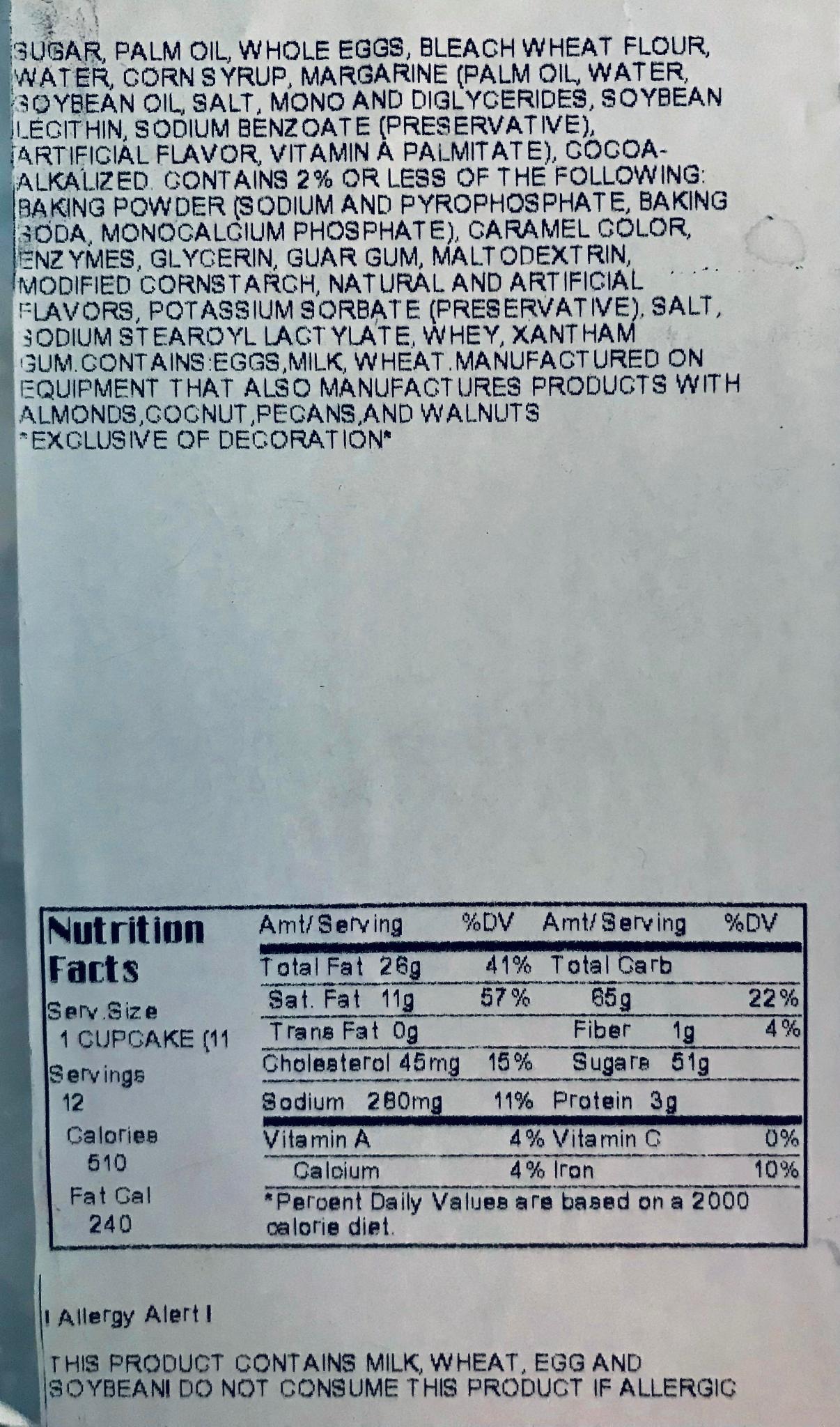 A Dozen of Large Cup cakes with cup cake toppers $30 (Wellsley Farm, Non-PHO, No HFCS, Kosher OUD) check the nutritional facts below in the gallery of pictures,