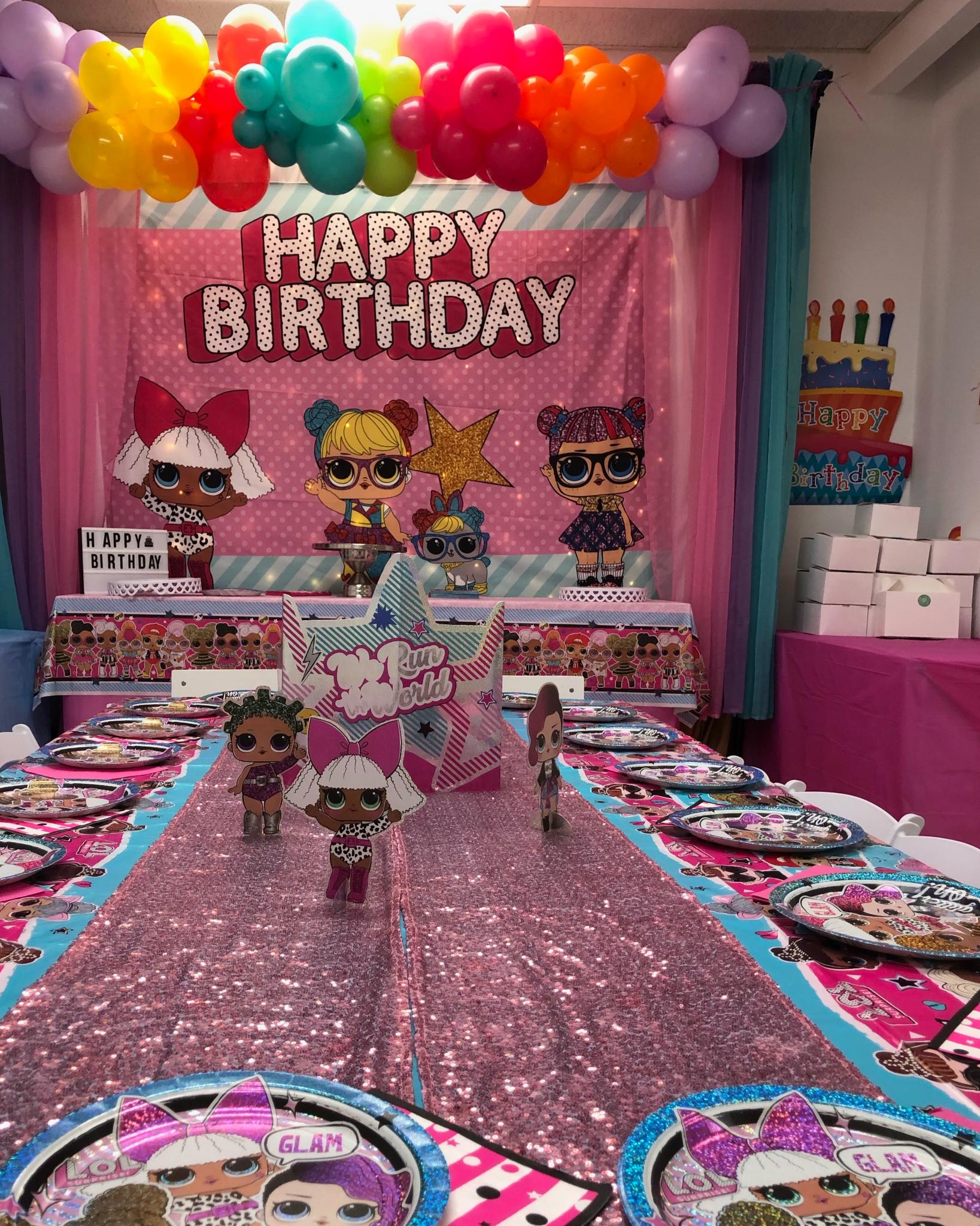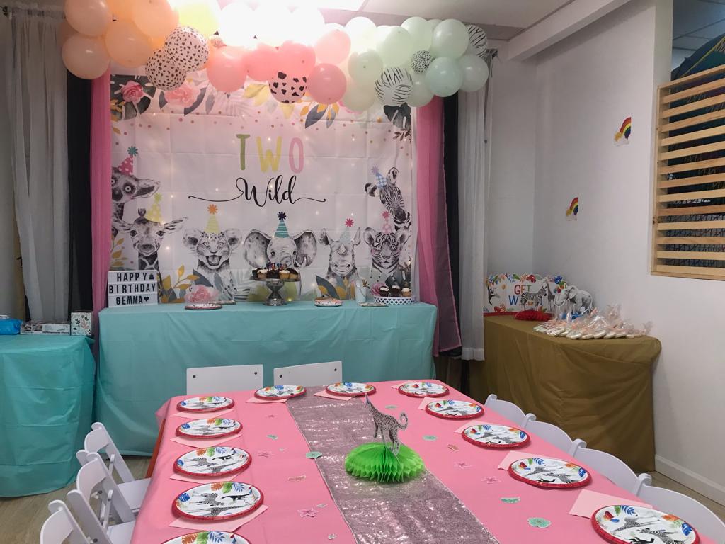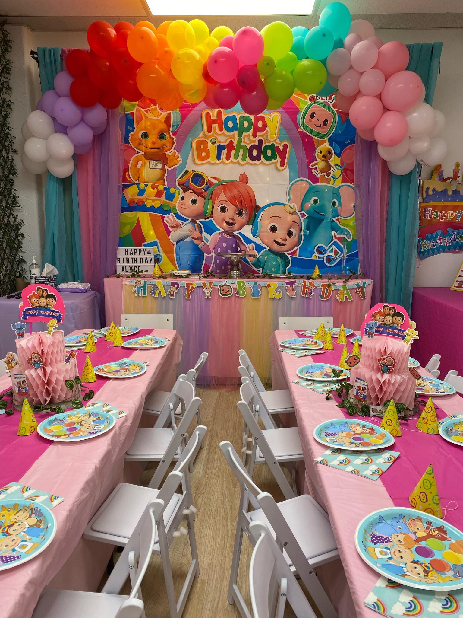 - Themed birthday package is up to 14 kids and 6 extra kids per $25 each. You can choose one of our themed packages in our photo gallery. You can not take balloon garlands, backdrop or any of our decoration props.