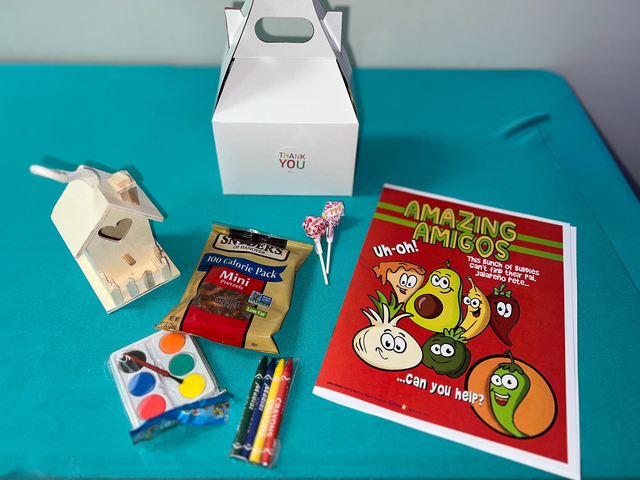 Goodie bags $9 per box. (includes two lollipops, wooden signature house, watercolors a snack, mini coloring book, and crayons)